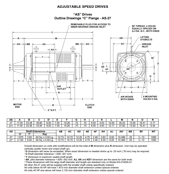 AC power input – AS drives and controllers are available to run on virtual any 3-phase voltage input, which makes them compatible with existing wiring and plant power. Approximately 250% motor torque available at clutch output. Accelerates high inertia loads quickly and handles intermittent overloads without having to increase the horsepower rating.